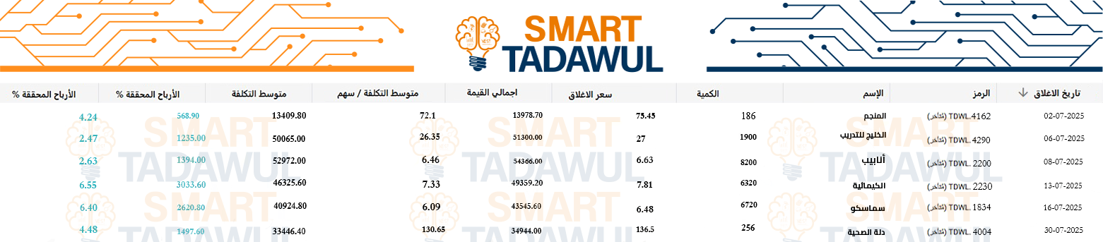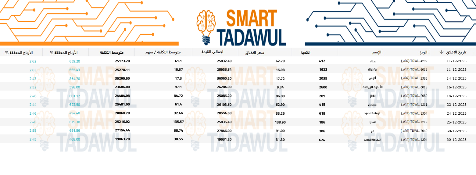 قم بتحميل تطبيق سمارت تداول الآن!نحن نقدر ثقتك فينا لأبعد الحدود، وهذه هي صفقاتنا الفعلية التي تمت من خلال توصياتنا الاستثمارية واشعارات التطبيق لدينا المبنية بالكامل على الذكاء الاصطناعي ولأول مرة في الشرق الأوسط.لا تفوت هذه الفرصة الرائعة لاستثمار أموالك وتحقيق أهدافك المالية.